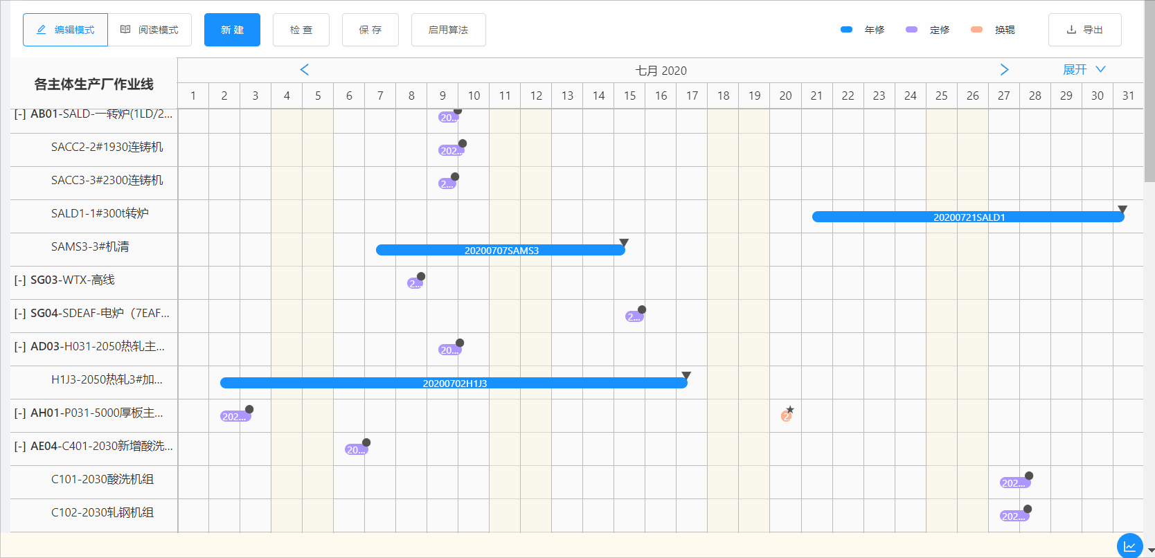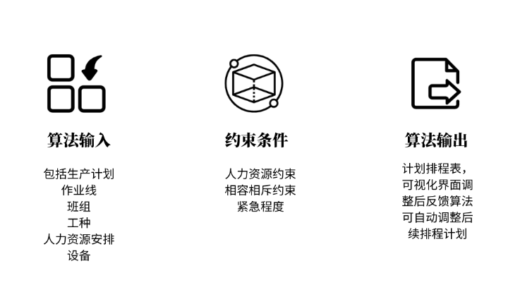 • 根据场景建模、约束条件、历史执行数据,运用智能算法生成设定时间段的最优排程结果